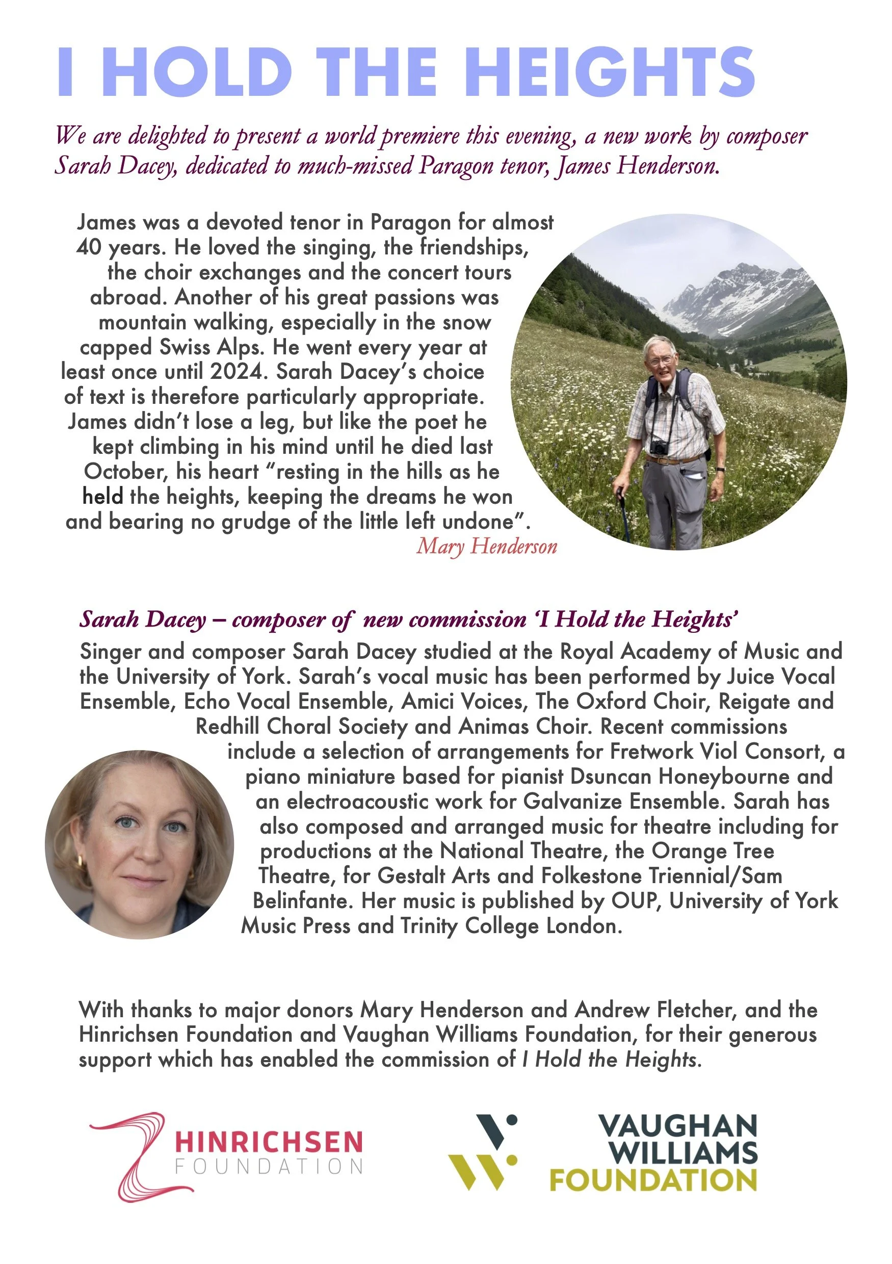 Paragon has a history of commissioning new work, and were very keen to mark our 50th anniversary by commissioning a female composer to write a work suitable for SATB choirs. We were delighted to appoint Sarah Dacey to write this new piece, I Hold the Heights, which was dedicated to much-missed Paragon tenor James Henderson in honour of his long and generous contributions to the choir.